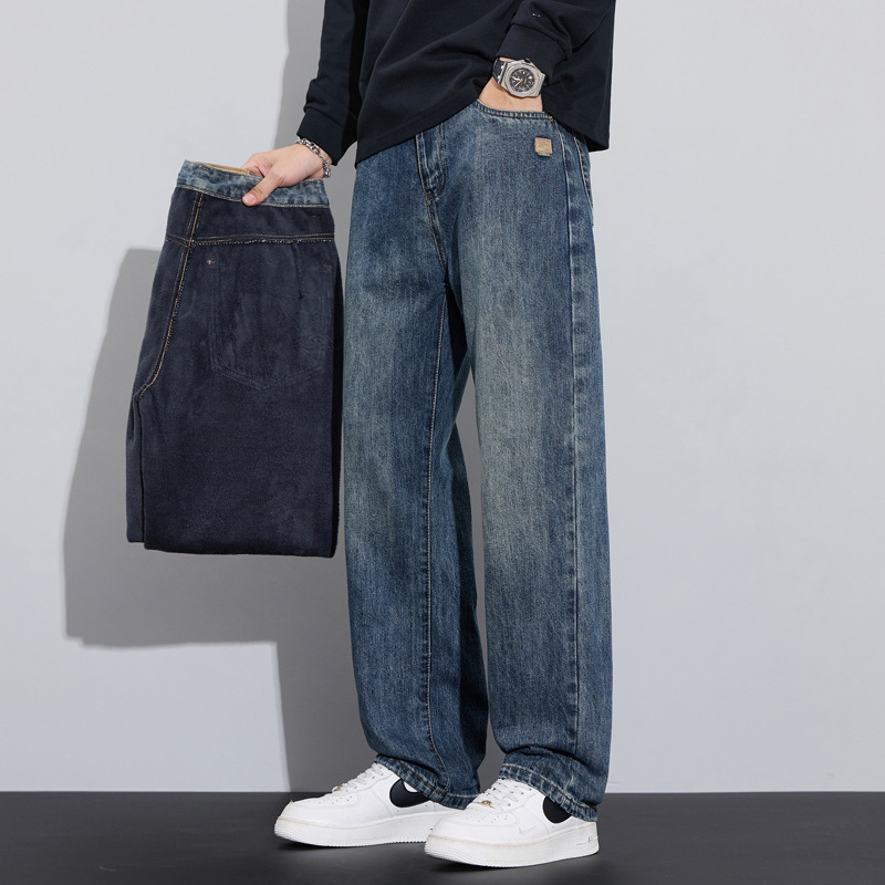 Loose straight plus velvet denim trousers trendy and versatile American retro casual trousers